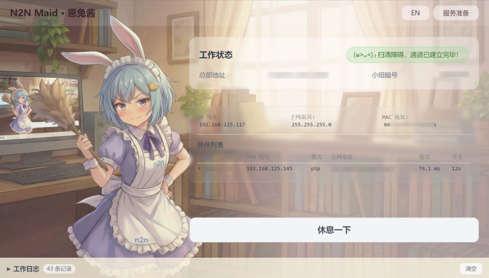工具的门槛,不应成为友谊的绊脚石。恩兔酱让过去那些晦涩的参数配置,现在被简化为了一份直观的"家政需求单"。想要组建一个虚拟局域网,用户只需最开始告诉她一些基本信息,以后都能一键直连 。同时,也支持列举局域网设备、实时测测延迟、看看有没有 p2p 打洞成功等实用功能。