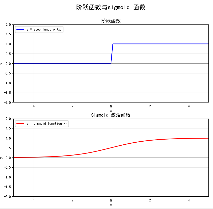 - 是"平滑性"的不同。sigmoid函数是一条平滑的曲线,输出随着输入发生连续性的变化。而阶跃函数以0为界,输出发生急剧性的变化。