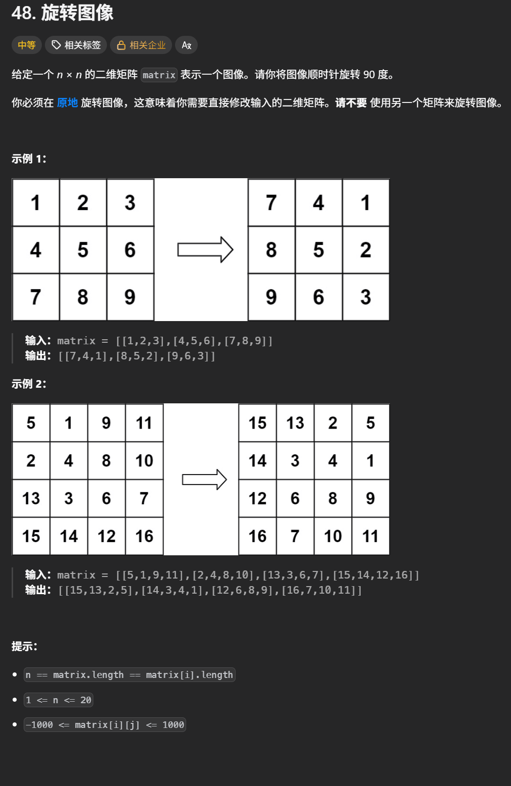 1.题目要求:把一个方阵(n * n的矩阵)顺时针旋转90°。且要求不能创建另一个矩阵,空间复杂度必须是O(1)。