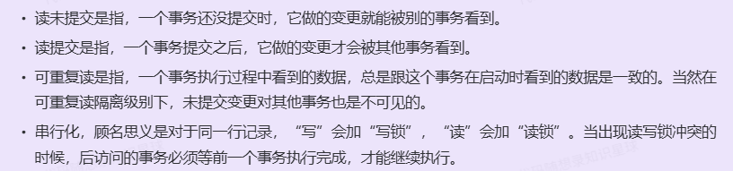 直观理解: 这就是你刚才问的部分。MVCC 让不同的事务在同一时间看到的是不同版本的数据(通过 ReadView 和 Undo Log 拼凑),从而让事务之间像是在"互相隔离"的平行时空里运行,互不干扰。