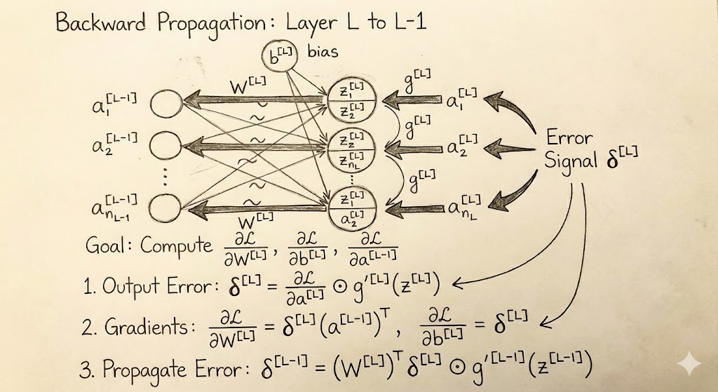 正向传播算出了预测值,发现和真实值有误差(Loss)。反向传播就是要把这个"锅"(误差)甩回去,告诉前面的每一层:"你们的参数(W和b)该怎么改!"