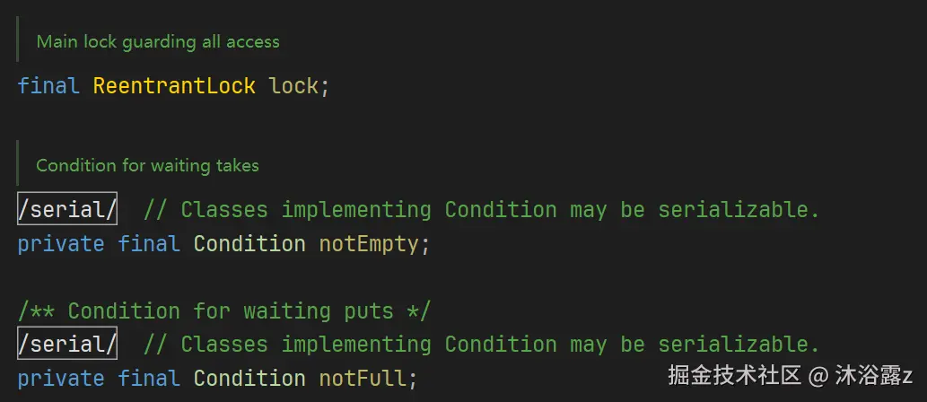 同时,我开篇也提到了,这样的阻塞队列必须是线程安全的,它底层使用了ReentrantLock来保证线程的安全。