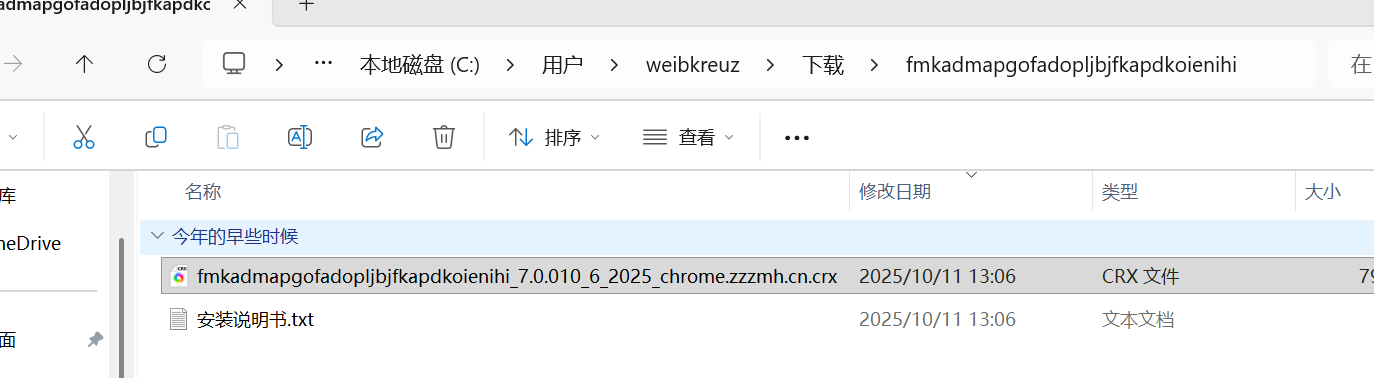 3)、其中名字中后缀是 `.crx` 文件就是安装包,鼠标长按拖住,拖到 '管理扩展程序' 页面,松开鼠标