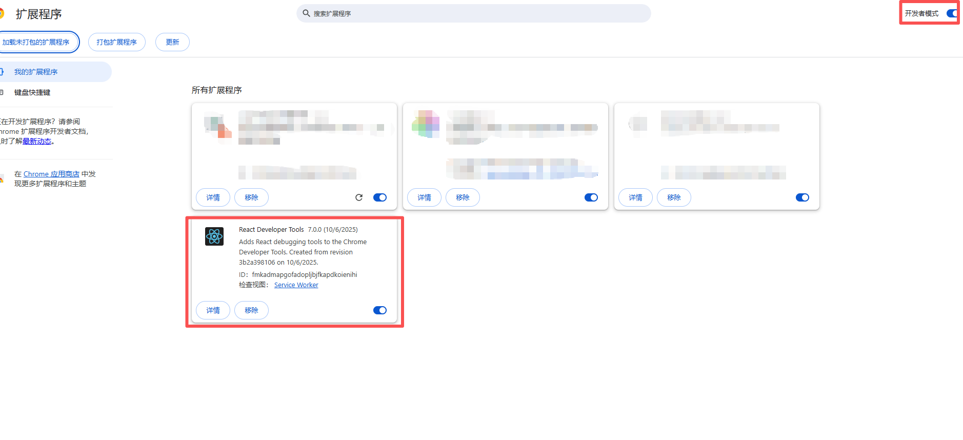 2)、'管理扩展程序' 页面的右上角 '开发者模式' 开关打开