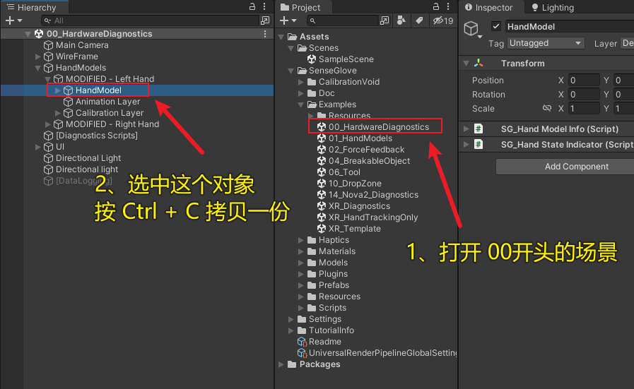 三、打开00...场景(注意保存原场景),拷贝HandModel游戏对象