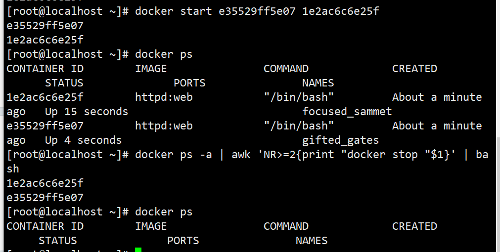 docker stop $(docker ps -q)docker ps -a | awk ... | xargs docker stop