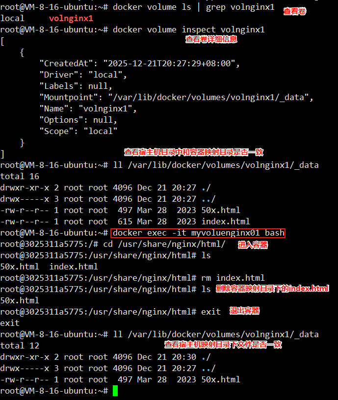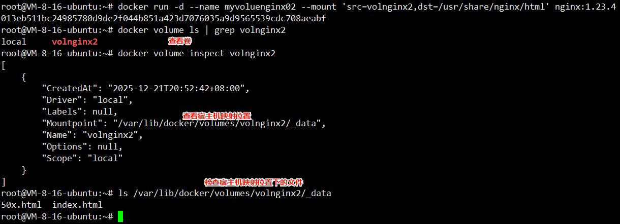 这句命令是运行nginx容器,后台运行,命名为myvoluenginx01,指定管理卷名称为volnginx1,映射到容器的目录为/usr/share/nginx/html/