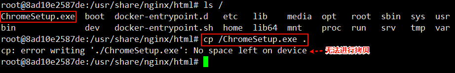 首先向容器内部拷入一个大于规定大小的文件,我是拷到容器的根目录下的