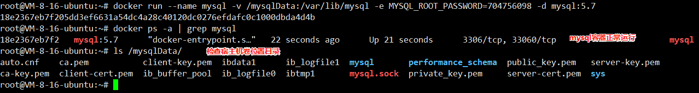 执行命令 docker run --name mysql -v /mysqlData:/var/lib/mysql -e MYSQL_ROOT_PASSWORD=704756098 -d mysql:5.7