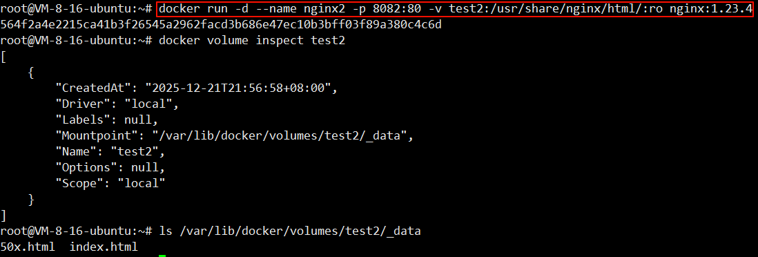 创建容器(命名卷),执行命令 docker run -d --name myvoluenginx02 --mount 'src=volnginx2,dst=/usr/share/nginx/html' nginx:1.23.4