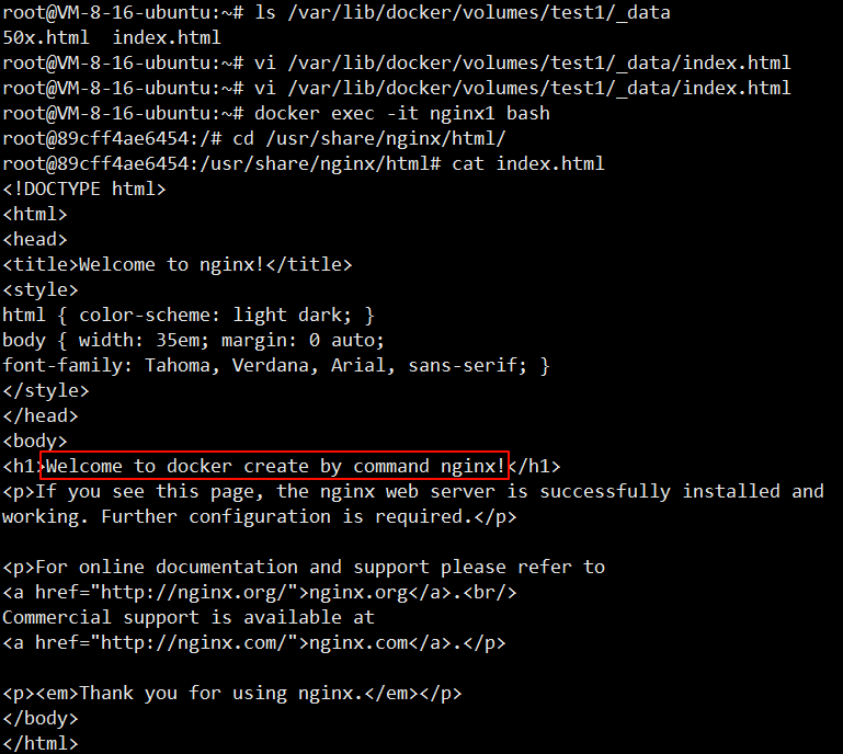 创建容器,执行命令 docker run -d --name myvoluenginx01 -v volnginx1:/usr/share/nginx/html/ nginx:1.23.4