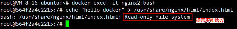 如果使用ro参数,即运行命令 docker run -d --name myvoluenginx01 -v volnginx1:/usr/share/nginx/html/:ro nginx:1.23.4