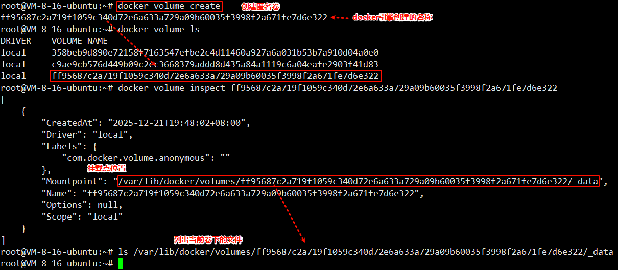 • volume docker 管理卷,默认映射到宿主机的/var/lib/docker/volumes 目录 下,只需要在容器内指定容器的挂载点是什么,而被绑定宿主机下的那个目录,是由容器引擎daemon****自行创建一个空的目录,或者使用一个已经存在的目录,与存储卷 建立存储关系,这种方式极大解脱用户在使用卷时的耦合关系,缺陷是用户无法指定 那些使用目录,临时存储比较适合;