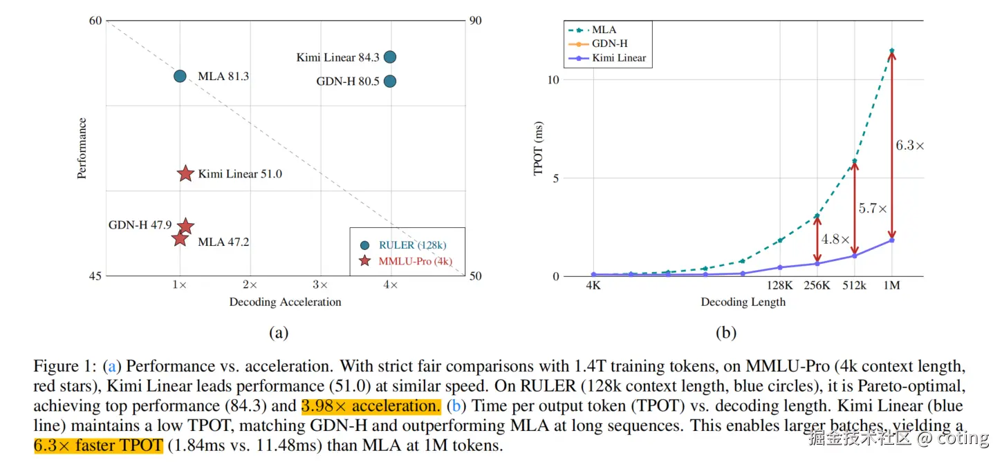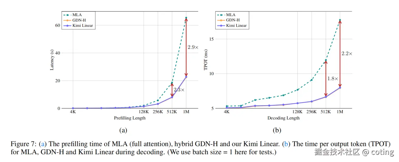 总结一下,Kimi Linear 的核心是 Kimi Delta Attention (KDA) 模块,它结合了创新的分块算法 (chunkwise algorithm)和硬件优化,不仅在所有评估任务上以显著优势击败了全注意力架构,还将 KV 缓存使用量减少了高达 75%,并在百万(1M)上下文长度下实现了高达 6 倍的解码吞吐量提升。