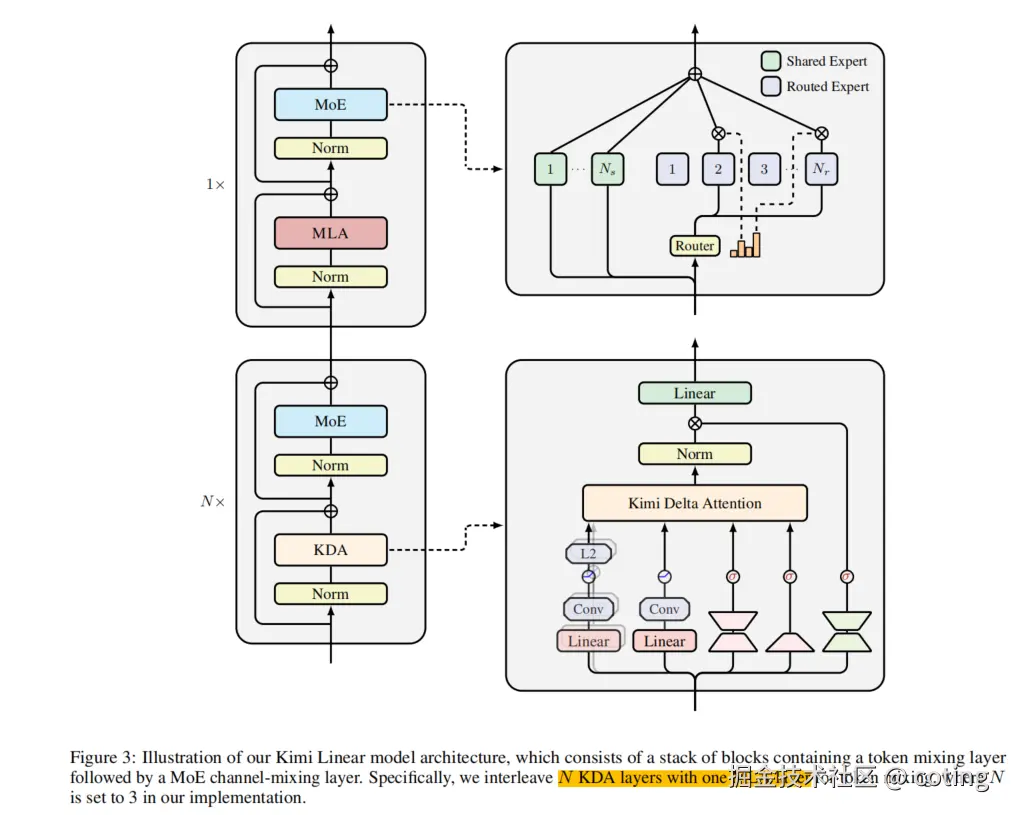 Kimi Linear 采用了一种层级混合 (layerwise hybrid)架构,将 KDA 与 Multi-Head Latent Attention (MLA) 结合起来: