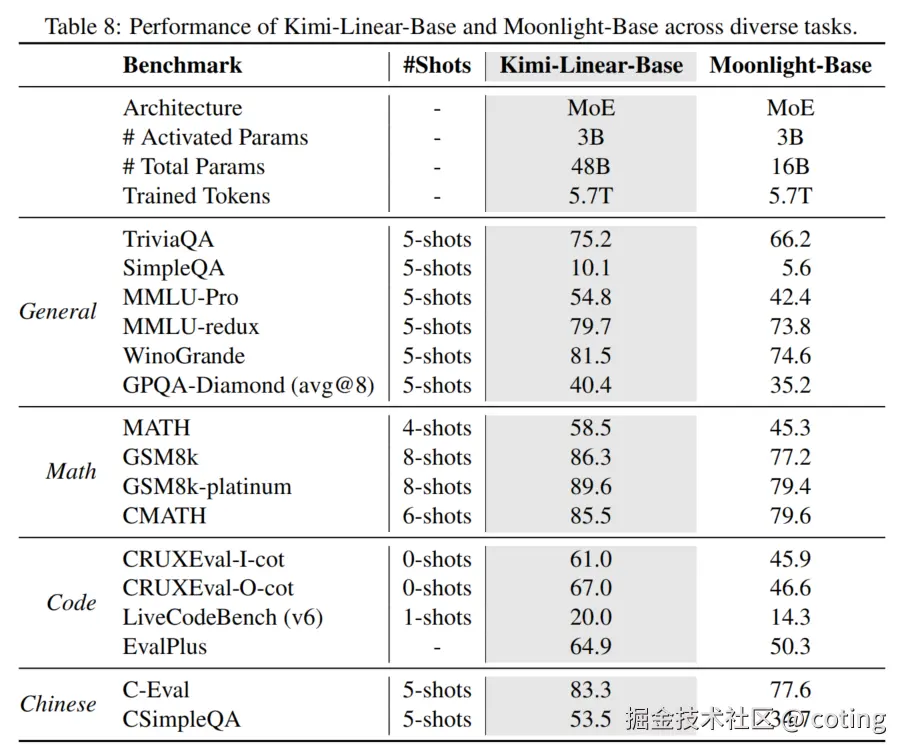 下表展示了 Kimi Linear-Base(MoE 48B Total Params)与 Moonlight-Base(MoE 16B Total Params)在多个基准测试中的性能对比。