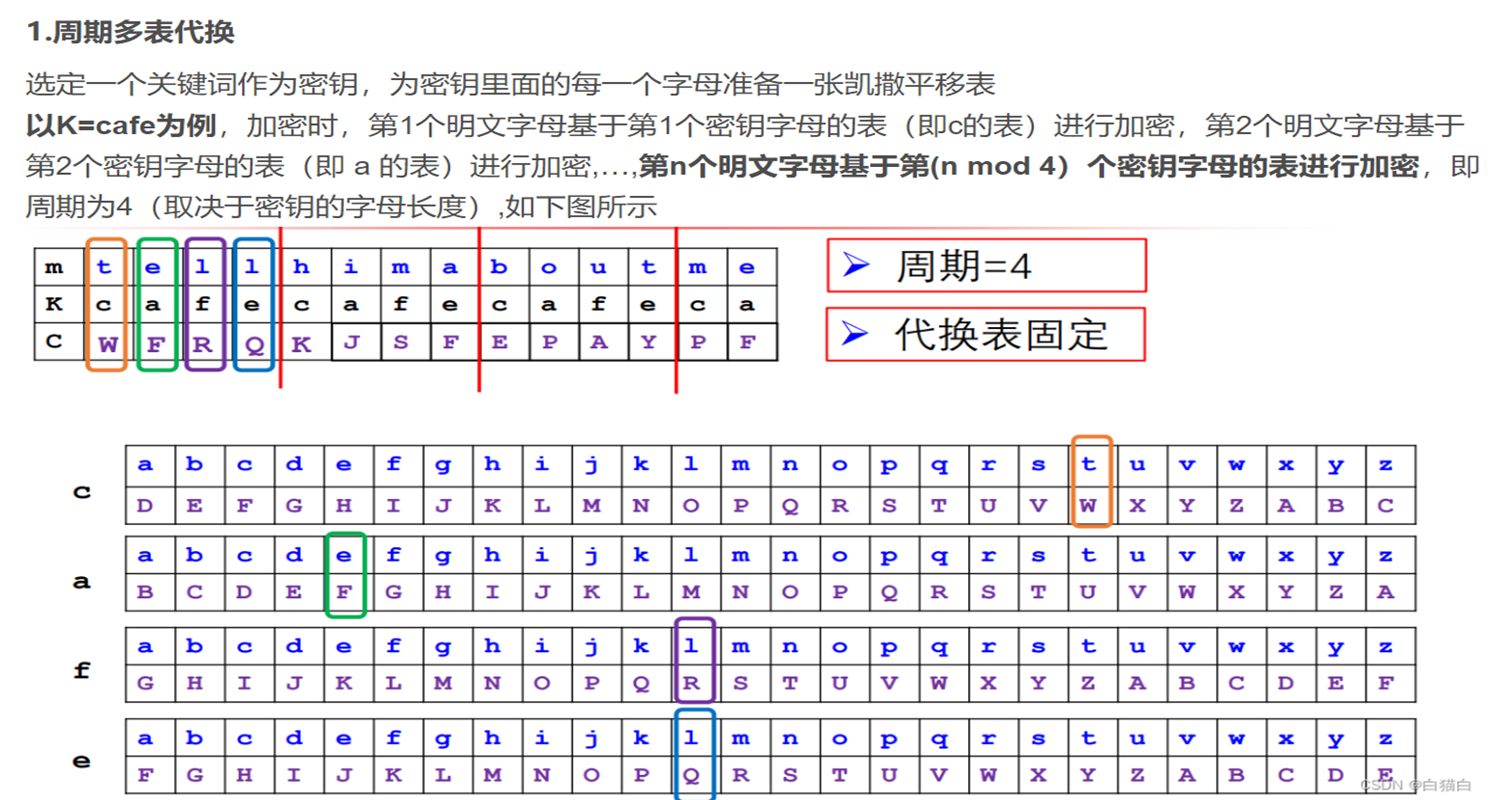 - 与单表代换密码相比,多表代换密码虽然能抵御简单的统计分析,但是,如果密码分析者能够确定密钥的长度,则多表代换密码的分析就可转变成为单表代换密码的分析。