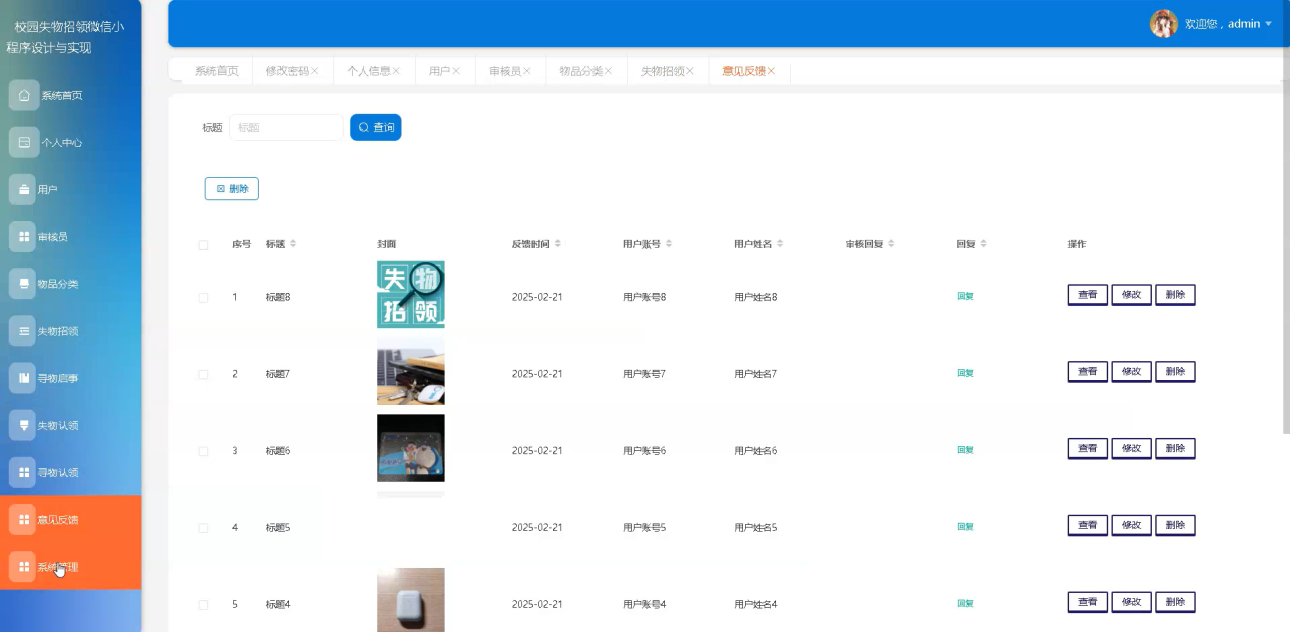 - 流程管理:失物认领流程 / 状态监督、意见反馈查看与处理;