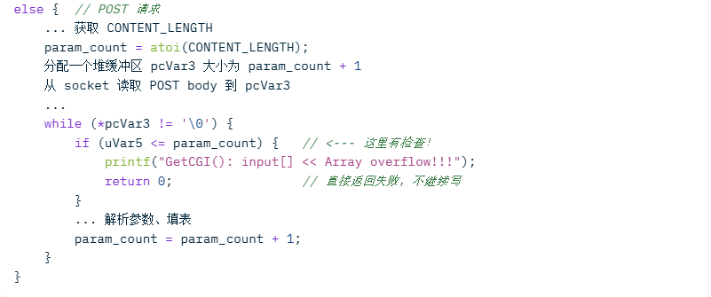 GET 请求路径:无边界检查 → 无数 & → param_count 无限++ → 栈溢出 → CVE-2024-41592