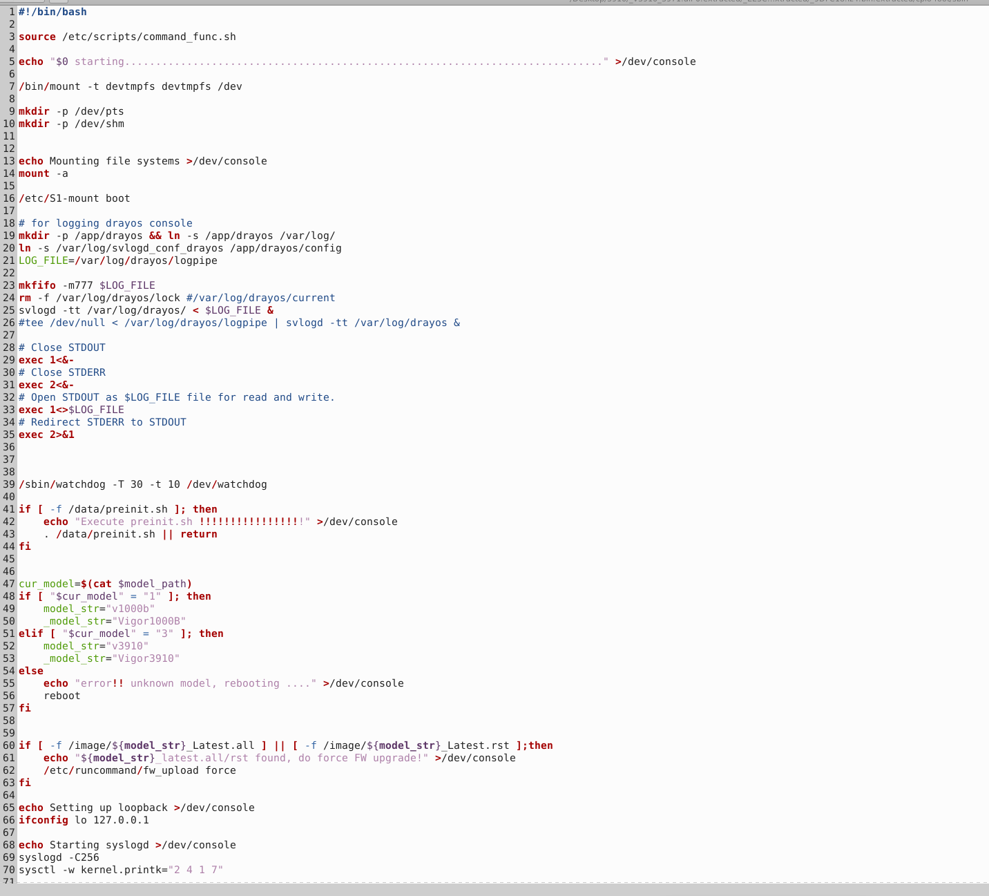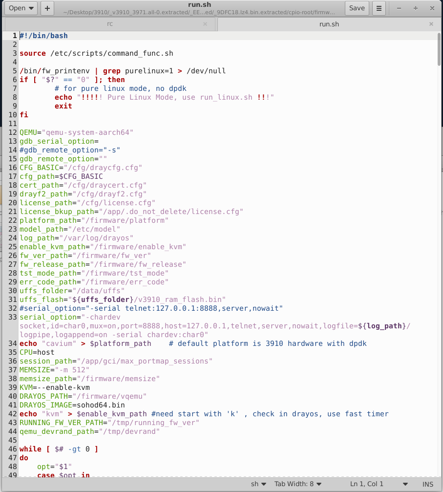 这个脚本是官方开发人员用来启动QEMU模拟环境的原始脚本,sohod64.bin就是核心固件,充当Kernel,其次DrayTek设备树文件(DTB),