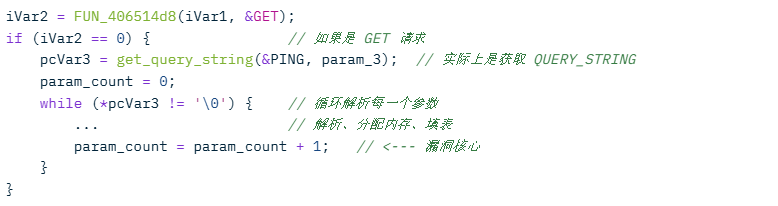 每次循环找下一个&,在栈上malloc并复制key/value字符串,把堆指针(或指针+1)写道栈上的参数表里面(param_2+offset),param_count++准备下一个槽位。