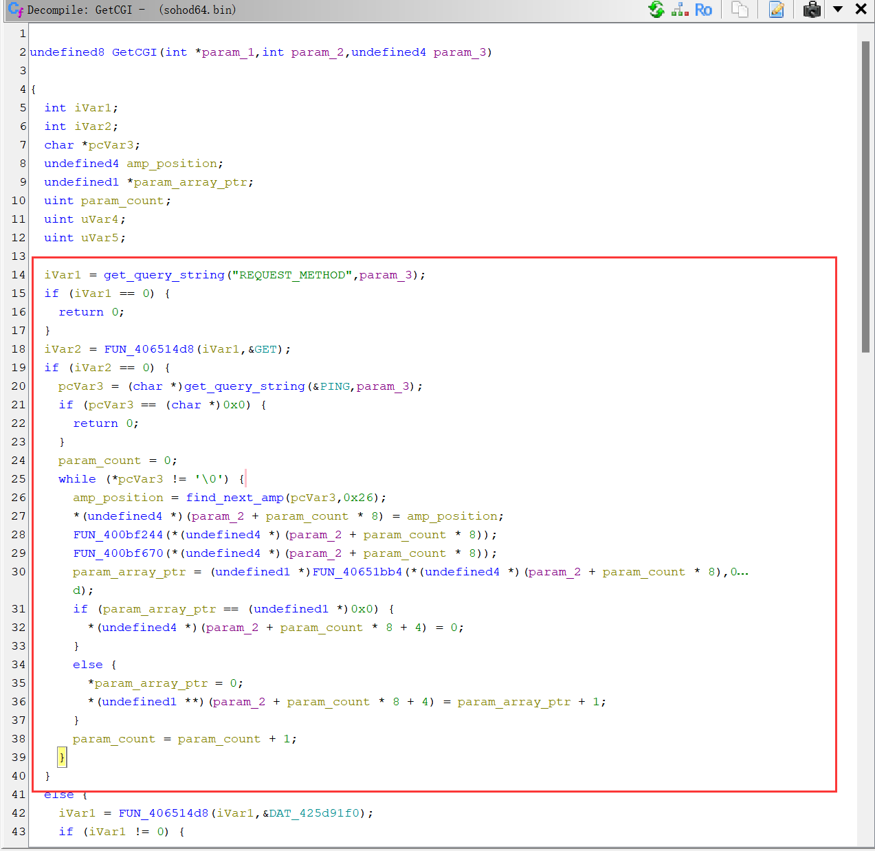 首先这里的param_2是GetCGI函数传入的一个指针,指向栈上分配的一个固定大小的参数表结构,从伪代码可推断大概的结构(AArch64 8字节对齐)
