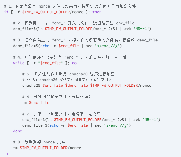 1、硬编码Nonce,他本意就是一次性数字,如果Key相同,Nonce每次都不同,但这里Nonce也是写死的,造成的安全问题就是我们抓到了两份同版本的固件,他的密文流是完全对应的,如果我们直到一个字节的明文,就能推出另一个。