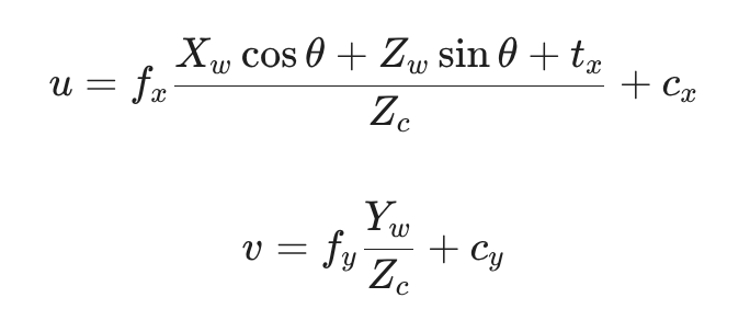 - X c = X w cos θ + Z w sin θ + t x X_c = X_w \cos\theta + Z_w \sin\theta + t_x Xc=Xwcosθ+Zwsinθ+tx