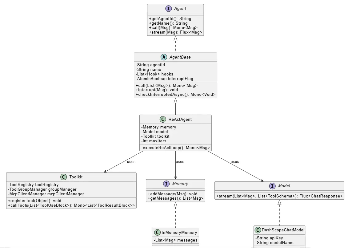 从代码结构来看,ReActAgent 继承自 AgentBase,而 AgentBase 又实现了 Agent 接口。这种设计让框架既保证了灵活性,又提供了统一的基础能力。