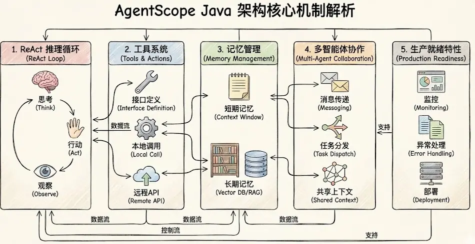 AgentScope Java 是一个面向生产环境的智能体编程框架,它巧妙地将大语言模型的推理能力、工具调用、记忆管理和多智能体协作整合在一起。本文将从架构设计者的视角,深入剖析这个框架的核心机制,看看它是如何让开发者用几行代码就能构建出具备自主决策能力的 AI 智能体的。我们会从 ReAct 推理循环、工具系统、记忆管理、多智能体协作和生产就绪特性这五个维度,逐一拆解其实现原理。