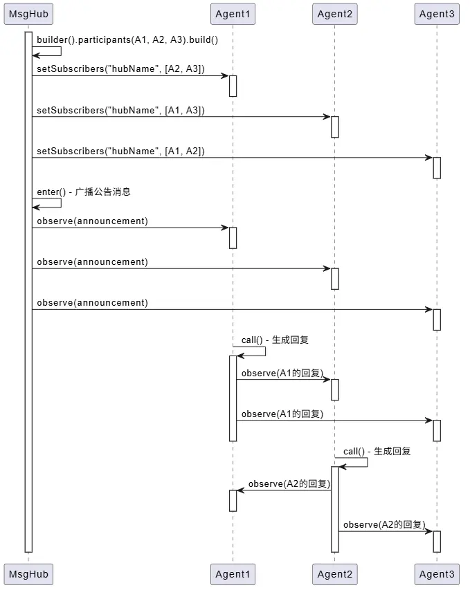 自动广播机制 :当智能体加入 MsgHub 后,框架会自动设置订阅关系。每个智能体发送的消息会自动广播给其他参与者,无需手动调用 observe()。