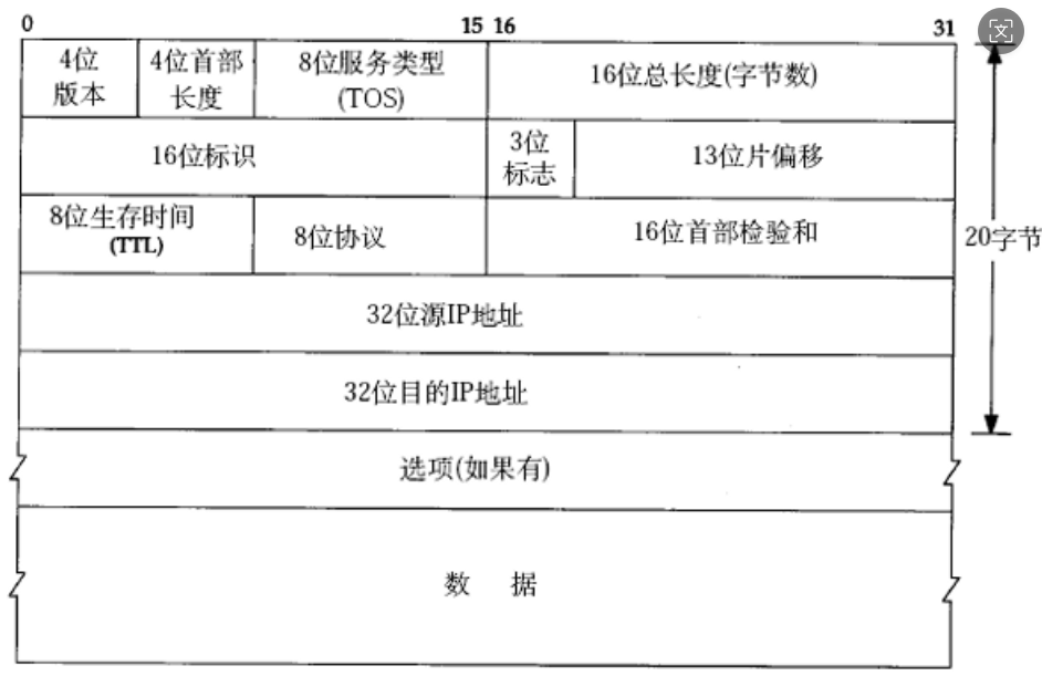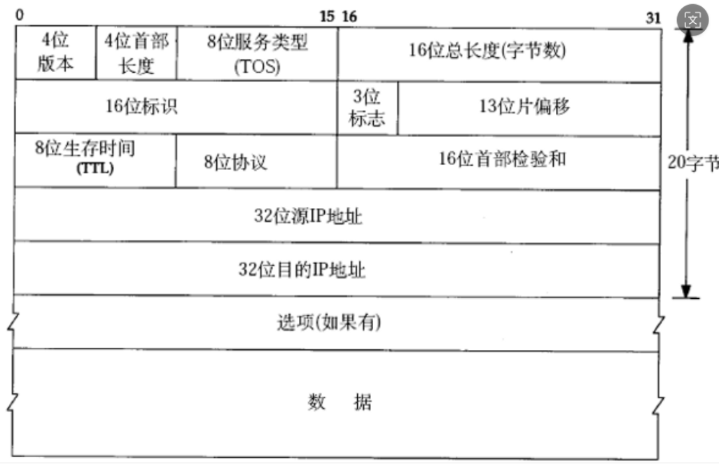 **16位首部校验和:**发送端计算报头的校验和,接收端重新计算,若不一致则丢弃数据包(检测报头是否损坏),tcp后面会进行超时重传,所以ip没有保证可靠性,而是tcp
