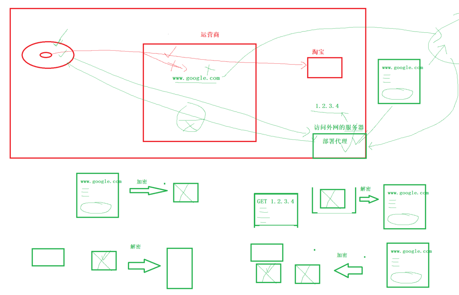 一般来说fq会给报文进行加密,然后发送给代理服务器,再由代理服务器转发出去,这期间运营商即使抓包了,但也发现不了你访问的是谷歌这样的外网,因为你加密了,它不知道报文是啥,但是他可以通过监控等各种手段,比如IP黑名单,对于一些境外违规代理,他发现你访问代理IP,直接丢包,还有其他很多手段,比如流量特征分析等等
