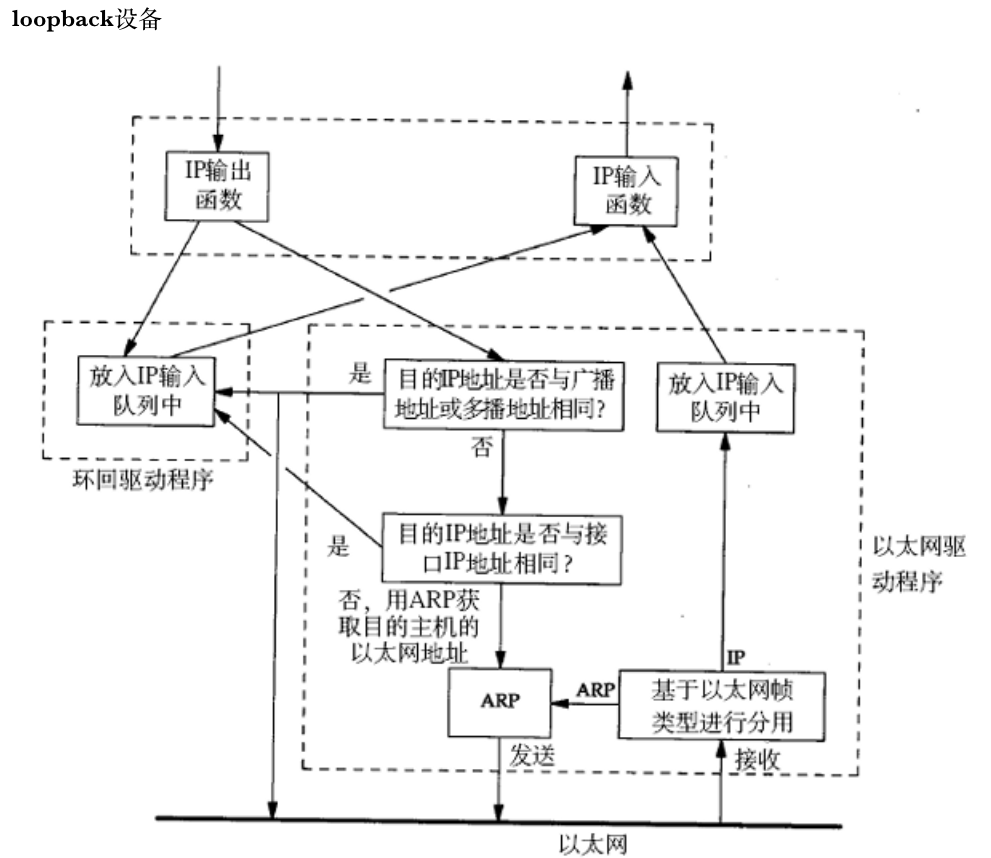 这张图是Linux(或类 UNIX 系统)中 "环回设备(loopback)+ 网络协议栈" 的数据包处理流程 ,核心展示了本地数据包(发往环回地址)和外部数据包(以太网)的处理逻辑