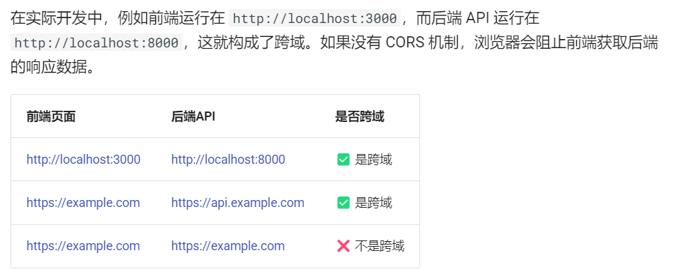 当前端页面的协议、域名、端口与后端 API 的协议、域名、端口不一致时,浏览器会在接收后端响应后拦截数据;而 CORS(跨域资源共享)通过服务端配置响应头,让浏览器判定该跨域请求合法,从而放行响应数据,解决同源策略导致的跨域拦截问题。