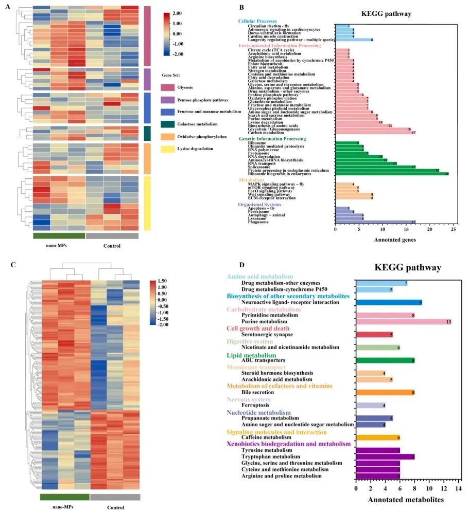 图:MPs暴露后凡纳滨对虾差异表达基因(DEGs)的 KEGG 分类及代谢组分析