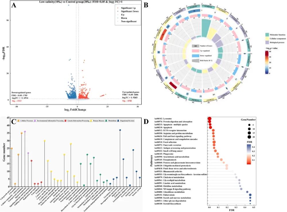 研究通过整合生存率、酶活、组织学和转录组学分析,系统探究了大竹蛏(Solen grandis)对急性低盐胁迫的生理及分子响应机制。暴露于10 ‰盐度环境96小时导致了严重的生理紊乱,生存率降至10 %以下,其96小时半致死浓度(96-h LC50)为13.216 ‰。与对照组(28 ‰)相比,低盐胁迫显著抑制了(p < 0.05)摄食率、排氨率和耗氧率。肝胰腺组织病理学检查显示腺泡肿大(面积增加3.45倍)、管腔结构紊乱及细胞质空泡化,表明渗透调节功能衰竭。酶谱分析显示由于盐度变化导致的调节失衡:Na+/K+-ATP 酶活性和丙二醛(MDA)含量显著激增(p < 0.05),而Ca2+/Mg2+-ATP 酶、抗氧化酶(T-SOD、CAT)、消化水解酶(胰蛋白酶、α-淀粉酶、脂肪酶)及溶菌酶活性则显著下降(p < 0.05)。转录组学分析鉴定出2865个差异表达基因,揭示了氧化应激和细胞凋亡通路的激活,以及免疫防御和营养代谢网络的抑制。这些发现描绘了一种协同应激反应机制,即能量被重新分配以维持离子稳态,从而牺牲了消化效率和免疫能力,最终导致死亡。该研究不仅从机制上深入阐释了潮间带双壳贝类对盐度波动的生态脆弱性,还为水产养殖健康监测提供了生物标志物,并为气候驱动的水文变化背景下的沿海生态系统管理提供了基础数据。