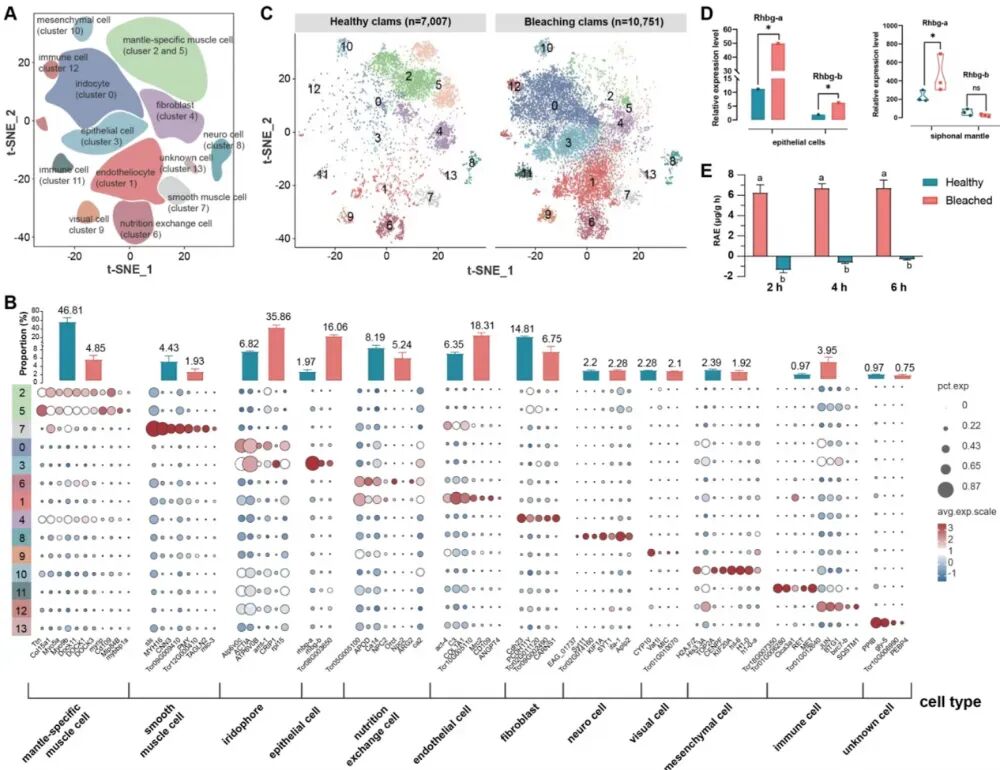 图:单核转录组分析揭示了健康与白化砗磲外套膜的差异