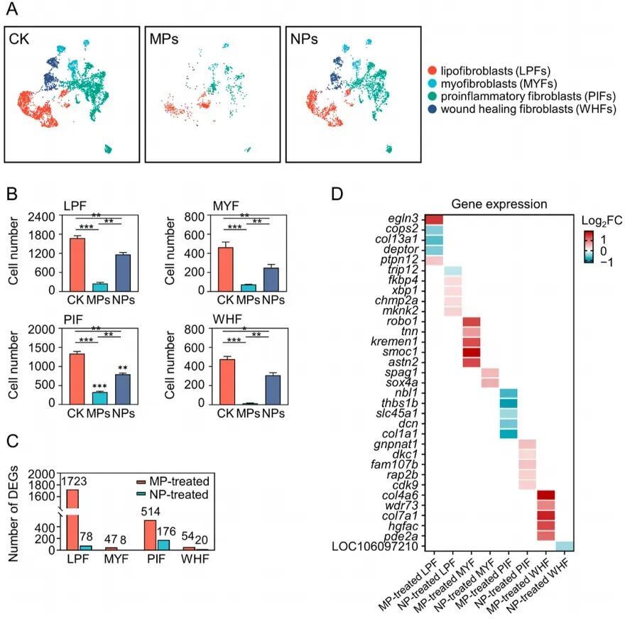 鱼鳃是对微塑料(MP)和纳米塑料(NP)入侵高度敏感的器官,但鱼鳃细胞对MPs和NPs的异质性反应仍很大程度上未知。研究利用单细胞RNA测序技术,研究了环境相关浓度的MP和NP暴露下,尼罗罗非鱼(Oreochromis niloticus)鳃中单个细胞群体的反应。根据检测到的差异表达基因(DEG)数量,MP暴露受影响最严重的免疫细胞是巨噬细胞,而NP的刺激主要针对T细胞。与富含Na⁺/K⁺-ATP酶的细胞和铺路细胞相比,富含H⁺-ATP 酶的细胞在应对MPs和NPs时表现出显著不同的变化。成纤维细胞被确定为MP与罗非鱼鳃相互作用的潜在敏感细胞型生物标志物,这一点可由其细胞数量的大幅减少以及在12个已识别细胞群体中检测到最多的差异表达基因所证明。在罗非鱼鳃中,对MP最敏感的成纤维细胞亚群是脂成纤维细胞。MP暴露显著抑制了罗非鱼鳃中成纤维细胞与富含H⁺-ATP 酶的细胞、神经元、巨噬细胞、神经上皮细胞以及富含Na⁺/K⁺-ATP酶的细胞之间的细胞间通讯。总而言之,该研究揭示了罗非鱼鳃对MPs和NPs的细胞异质性,并以单细胞分辨率为其毒理学机制提供了敏感的标志物。