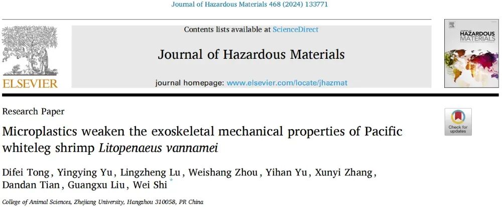微塑料会削弱凡纳滨对虾的外骨骼力学性能