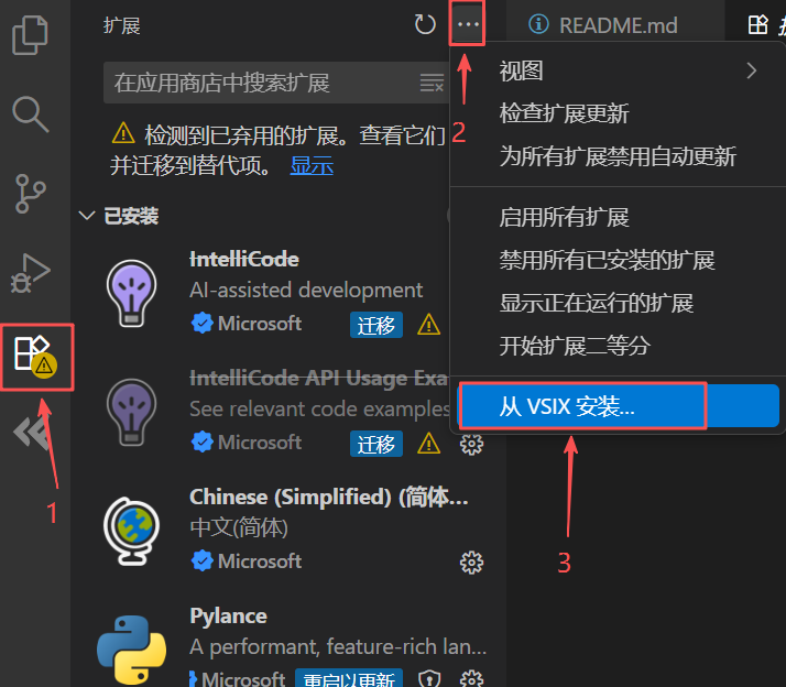 到vscode中选择 "从VSIX安装",选择下载的扩展文件进行安装即可
