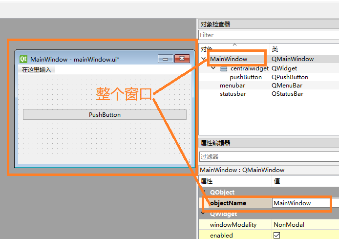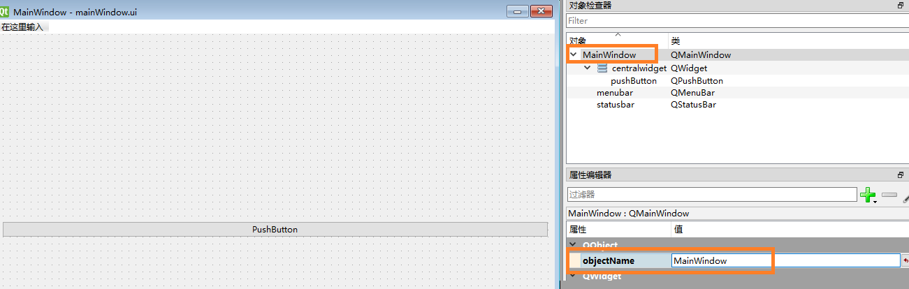 这个项目的主窗口文件mainWindow.ui,它的QT类是QMainWindow,它的QT内部名称(objectName)是MainWindow(这个也可以自己改,比如改成masterForm)。