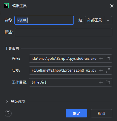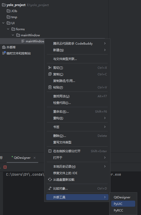 我已经提前创建了名称为yolo的conda环境,并安装了YOLO V11和PySide6,pycharm已经配置好了Qt Designer和pyuic。