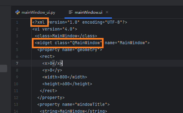它是一个 XML文件,文件描述了当前窗口以及窗口内所有控件的类名和特征以及从属关系,文件第一个widget class就是当前窗口的类名称,比如本例,它的窗口类是QMainWindow。