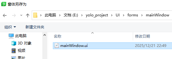 在项目的UI文件夹下新建forms\mainWindow两层目录,并将刚刚在designer中创建的.ui文件保存为mainWindow同名的mainWindow.ui文件: