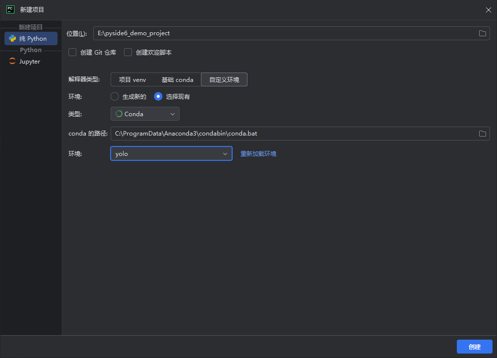 在pycharm中新建项目,选择创建好的名称为yolo的conda环境作为解释器: