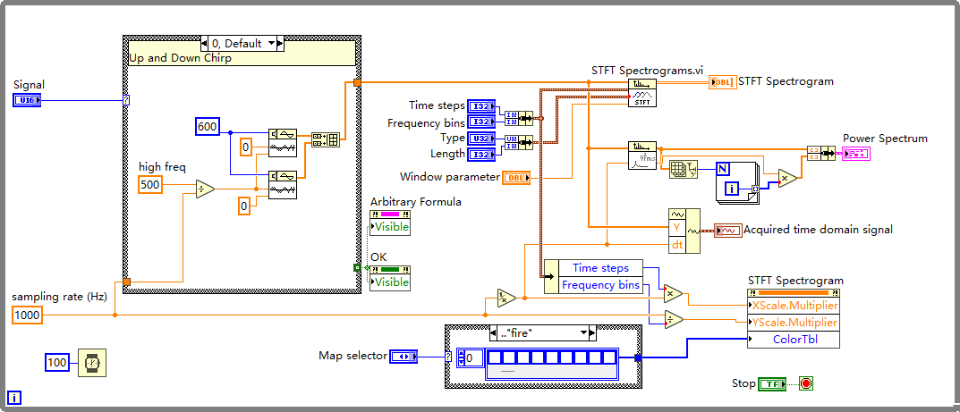 注意事项:先通过 "Butterworth Filter.vi" 预滤波降噪,再输入 STFT;