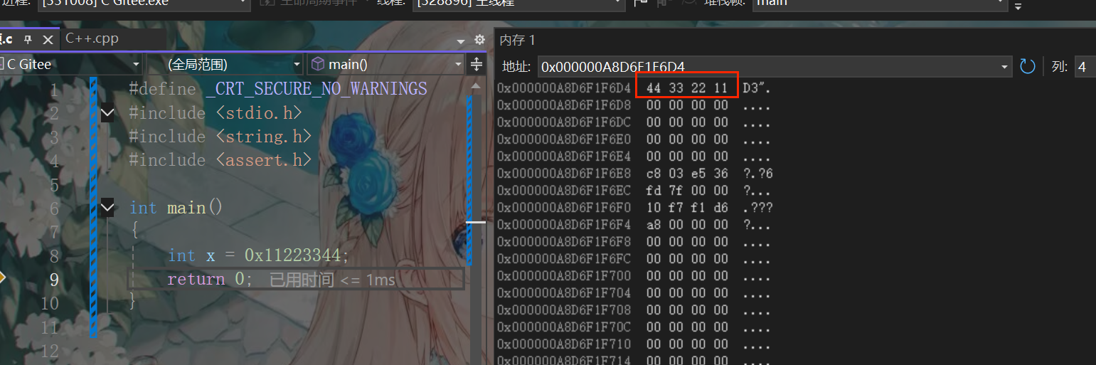 我们调试这个代码,来观察内存中x的11223344是怎么存放的,如下图