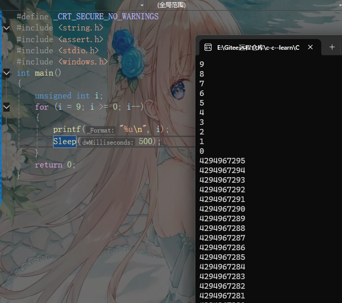 这题其实跟上题大差不差,当i是0的时候,i再--就是-1了,二进制补码就是11111111111111111111111111111111,因为是无符号整型,所以就变成了一个极大的数,然后又满足条件,就又死循环了,这个我们来看下运行图