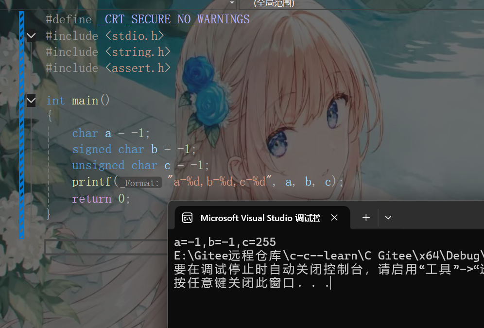再来看b,b是signed char类型,因为VS环境下char默认是有符号类型,所以a和b是一样的,所以b分析跟a是一样的,那么同理就是输出-1